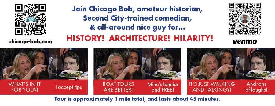 Join Chicago Bob, amateur historian, Second City-trained comedian, and all-around nice guy, as he walks about a mile and spends about an hour hilariously talking about Chicago history, architecture, and trivia!